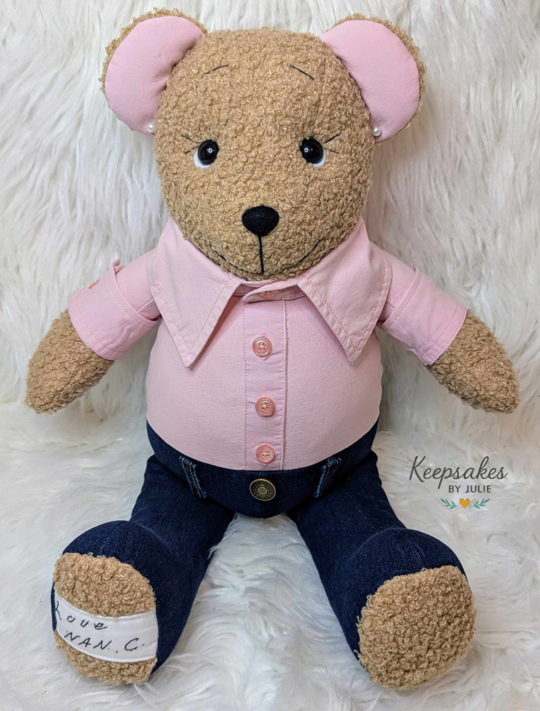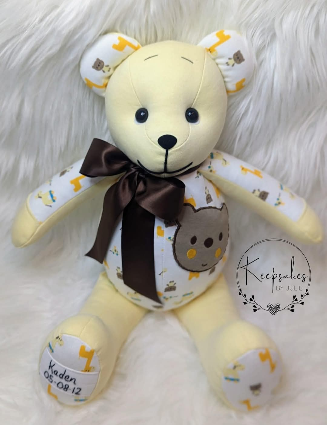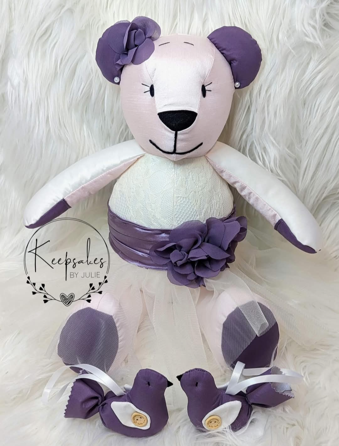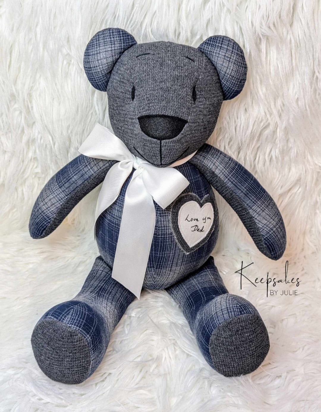 I 100% recommend Julie! Her Memory Bears are absolutely amazing! So well made & there actually bigger in person than you think! Julie is so friendly & easy to talk too. She makes sure that all details you would like happen! I absolutely love my memory bear & I will cherish it forever.