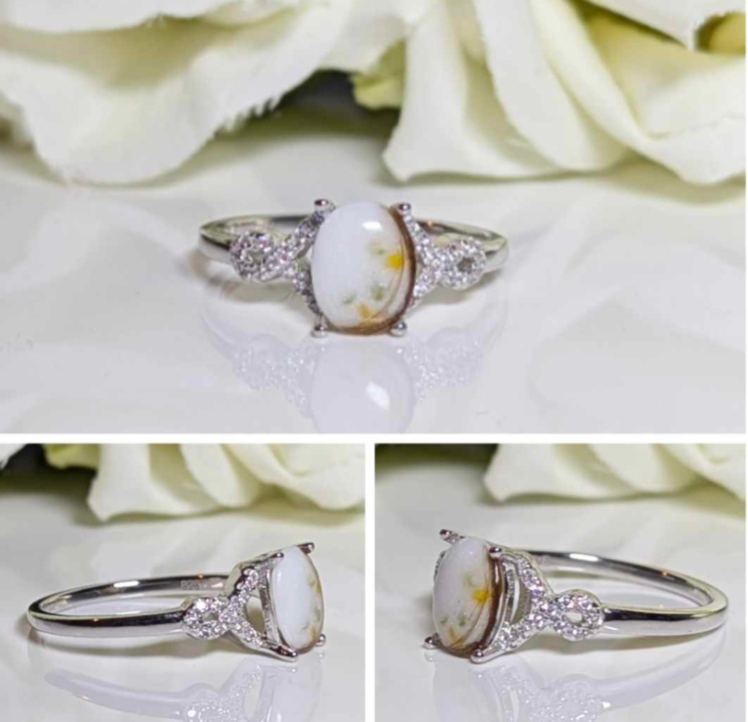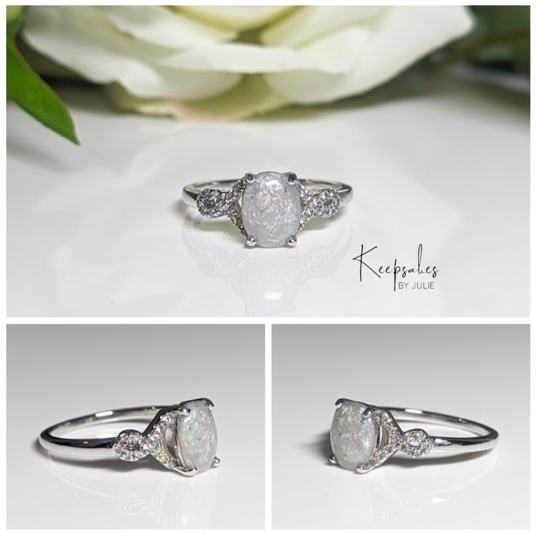 Shortly after my beloved Goldendoodle, Penny, passed away after blessing me with 12 1/2 years of unconditional love, I stumbled upon Keepsakes by Julie’s Facebook page. Her jewelry is beautiful and not at all “tacky” like some company’s keepsake pieces. I immediately knew I had to get a ring made. I ordered the silver twisted ring with resin stone in “pearl”. It turned out exactly as pictured on her page! I received it quickly and am so happy with the quality. Communicating with Julie was always quick and easy. I could just feel that she puts a lot of care into what she does. I would most definitely recommend her business for any keepsake items you may want. The leftover ashes were returned to me and I feel very confident that my Girl’s ashes were handled with TLC.