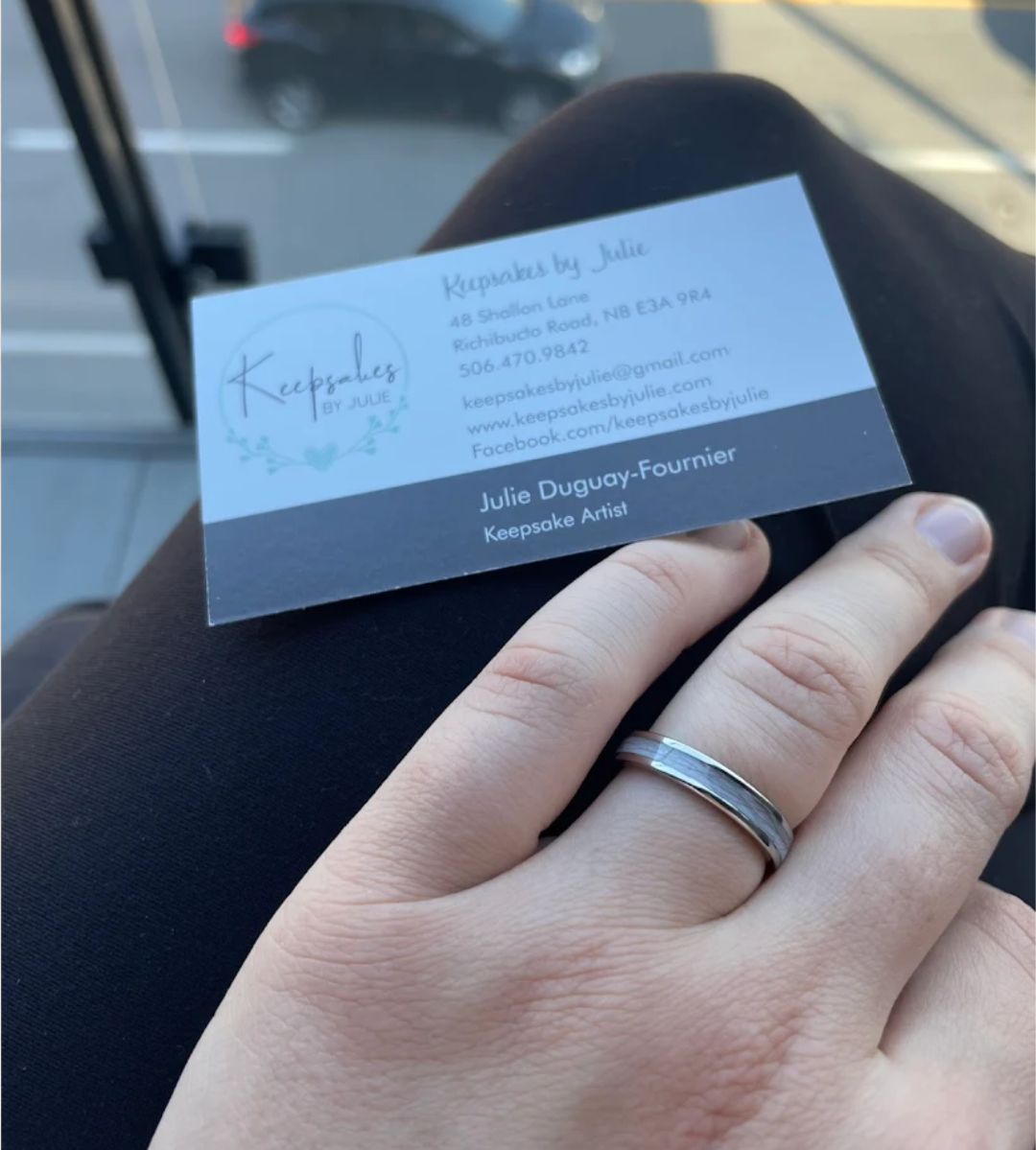 I lost my husband suddenly 12 weeks ago . I seen Julie’s beautiful work through social media and knew at some point I needed something made . I had a Halo ring made from his ashes along with some treasures made from his clothing . Everything was wonderfully and beautifully made with style and grace . I highly recommend Julie to handling your keepsakes.