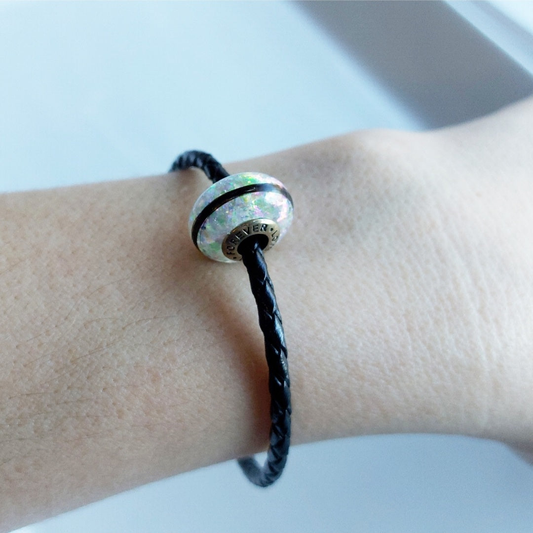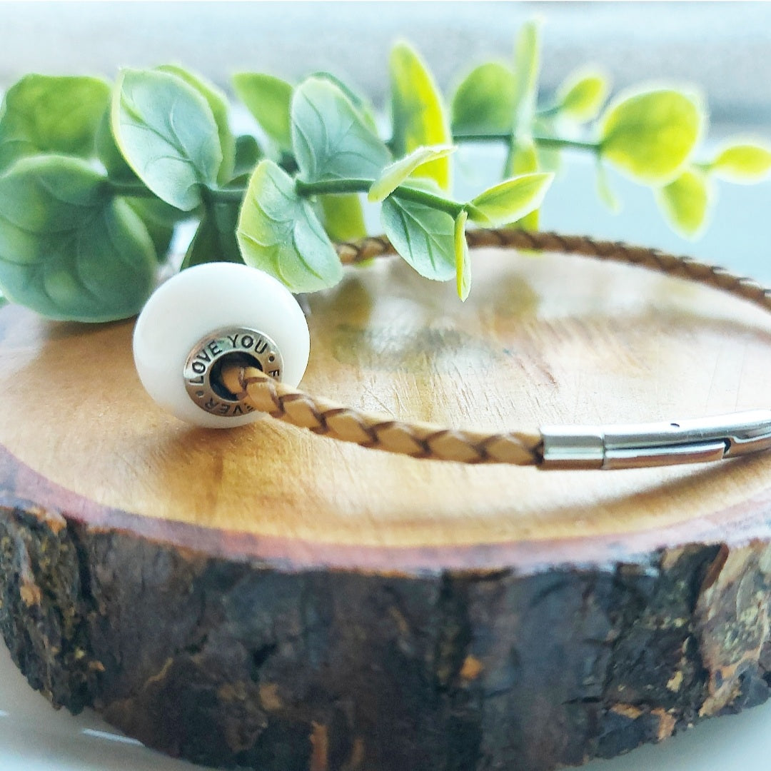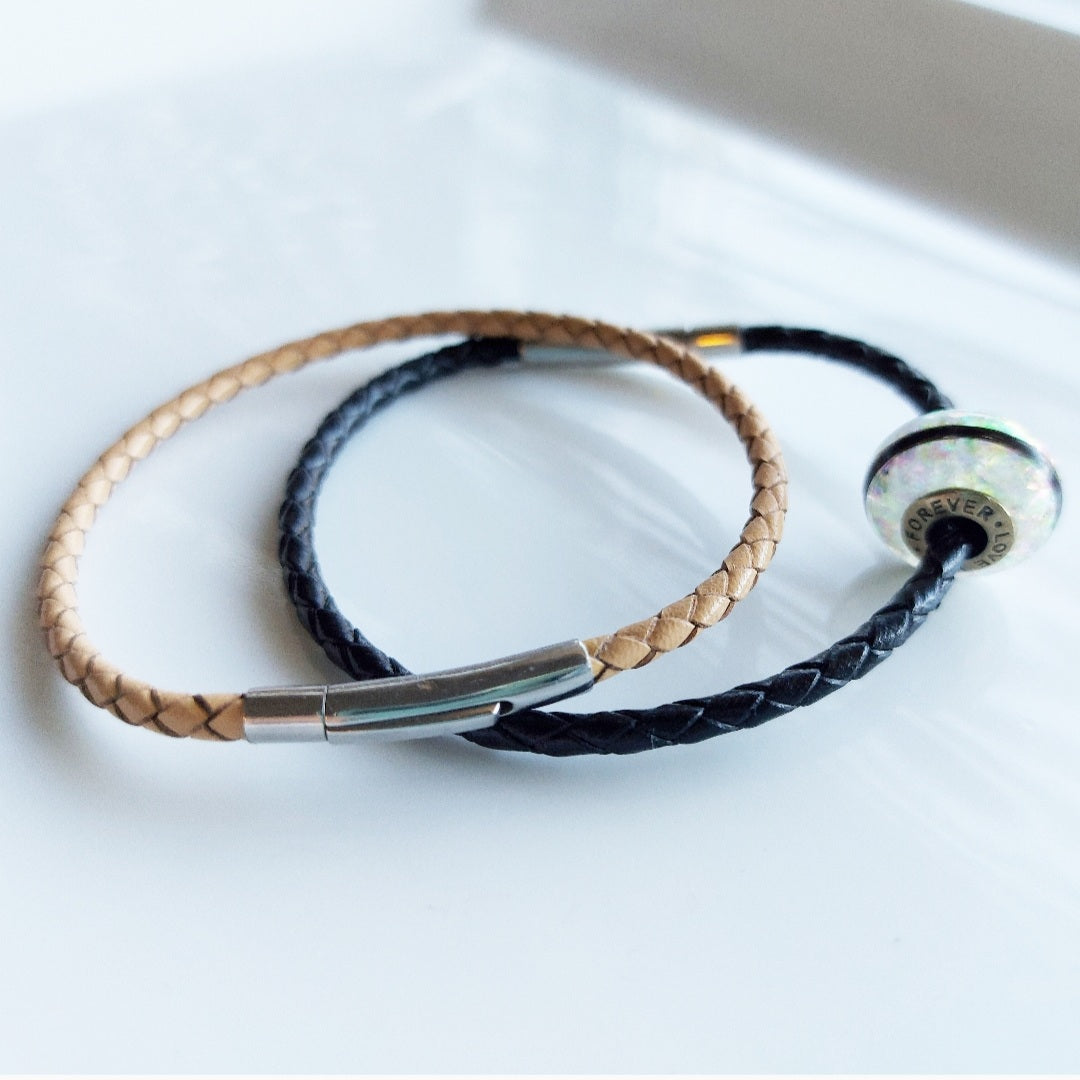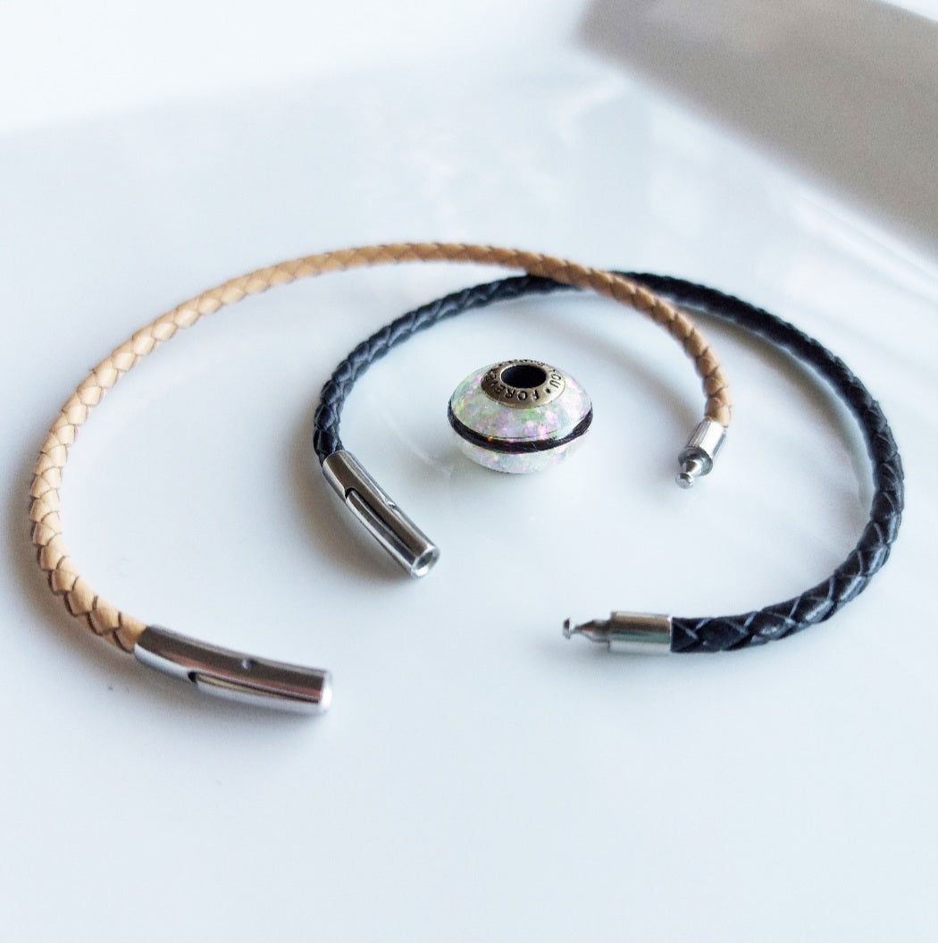 Braided leather bracelets for beads. Has a click-in tube clasp with push button.