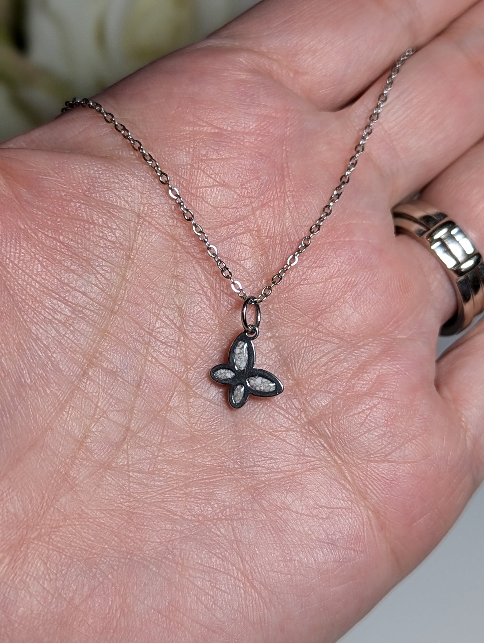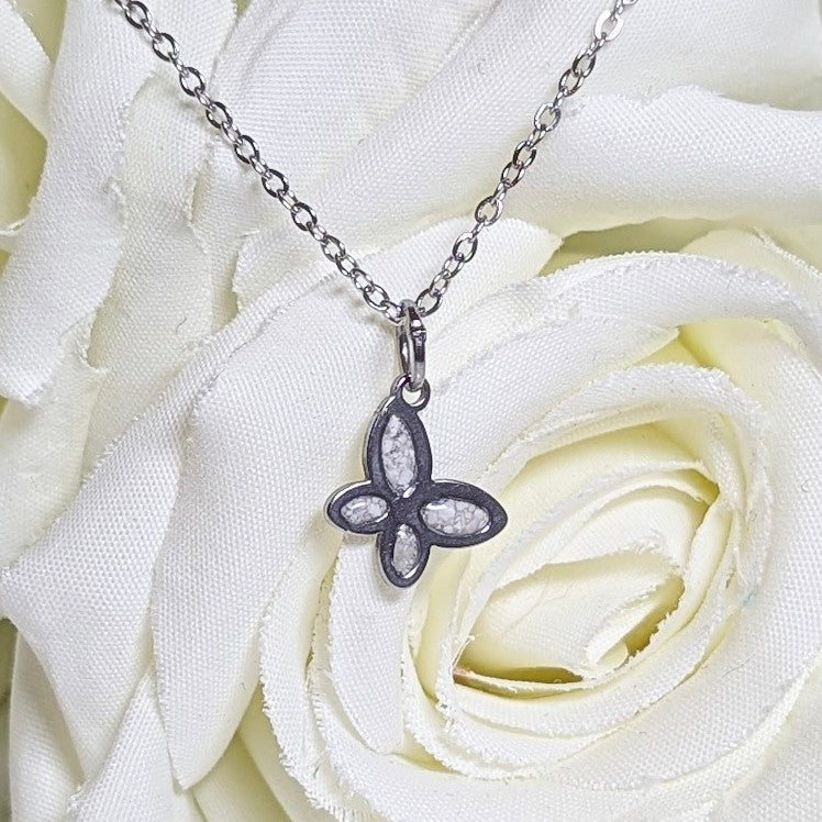 This dainty stainless steel butterfly pendant is perfect to hold cremation ashes. Includes an 18" chain.