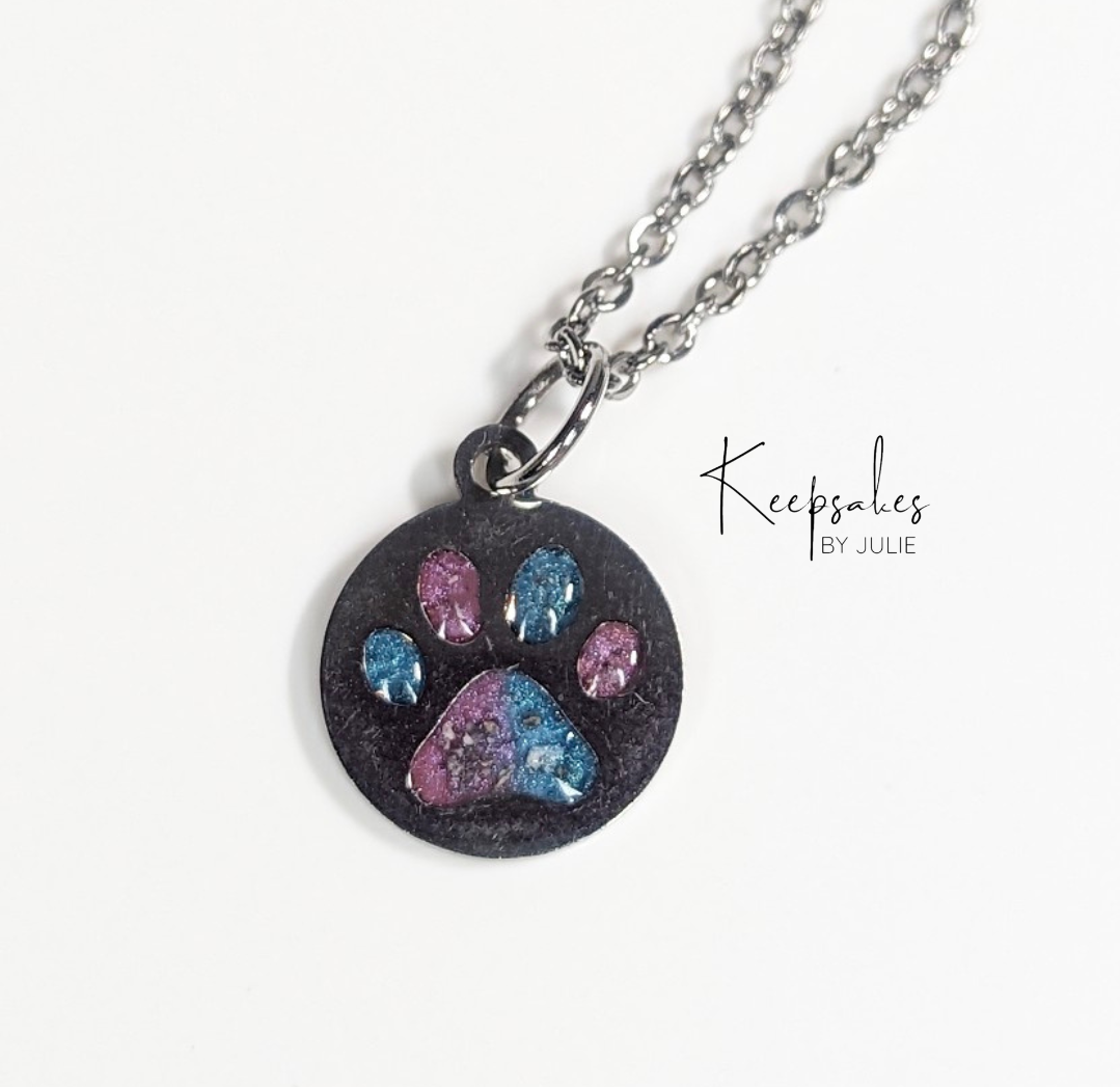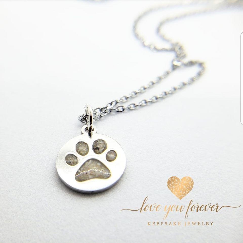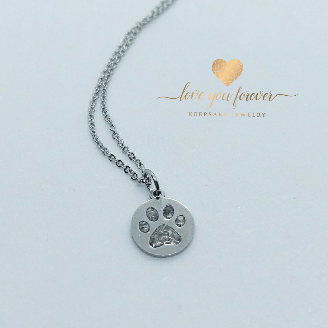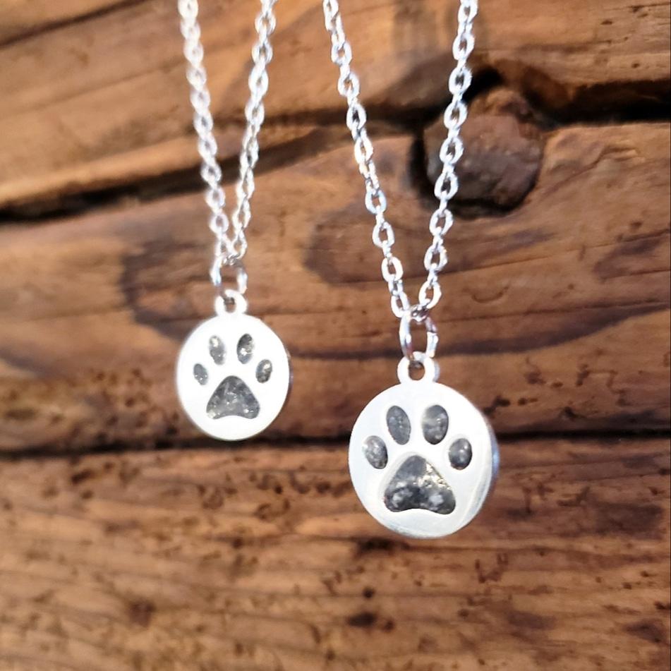This dainty stainless steel paw print pendant (14mm high)is perfect to hold the ashes of your pet dog or cat. Includes an 18" chain.