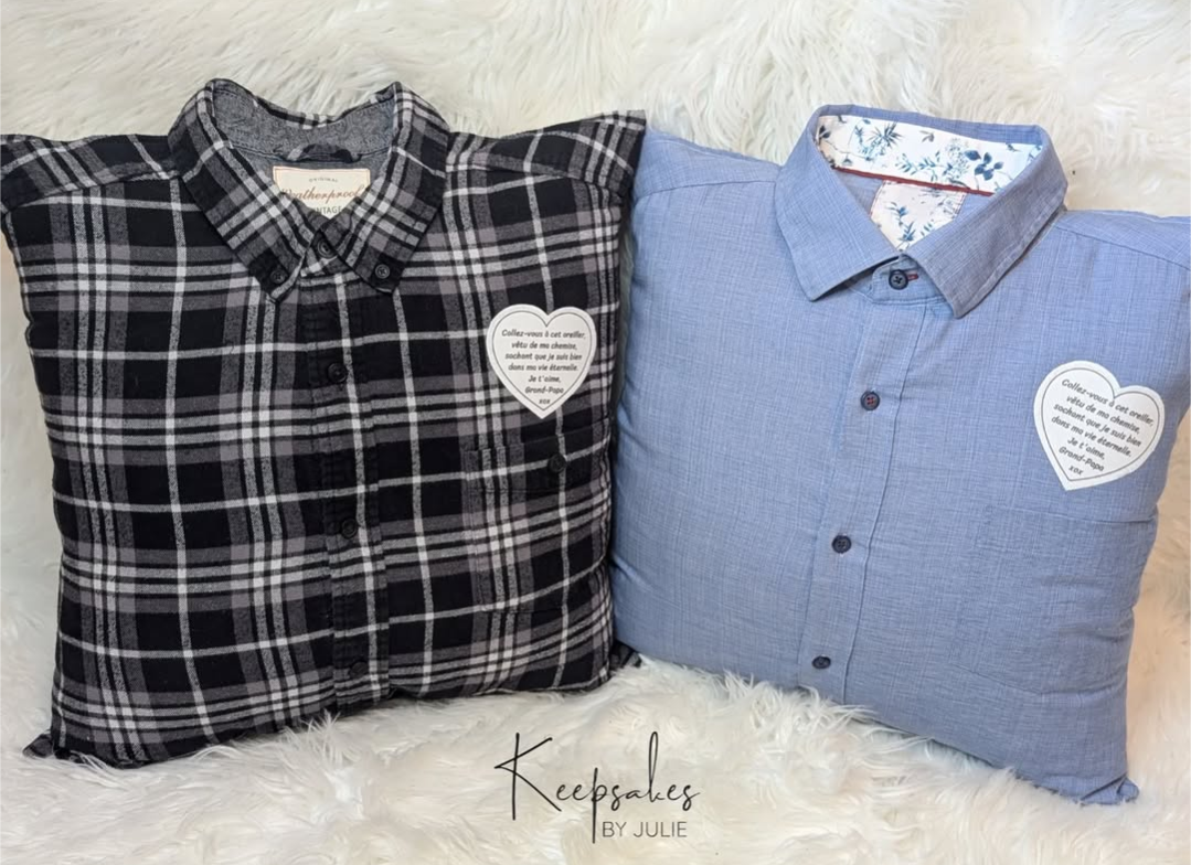 Turn a loved one's button-up shirt into a comforting keepsake pillow you can hold close. Each pillow is carefully handcrafted using a full shirt, preserving the character and details of the original garment — including the collar, buttons, and pockets when possible.
